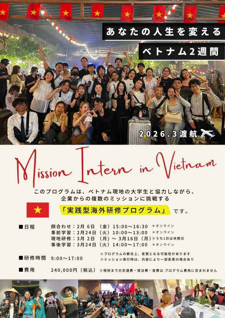 渡航期間:2026.3.2(月)~3.6(月) ※オンラインでの事前研修・事後研修あり