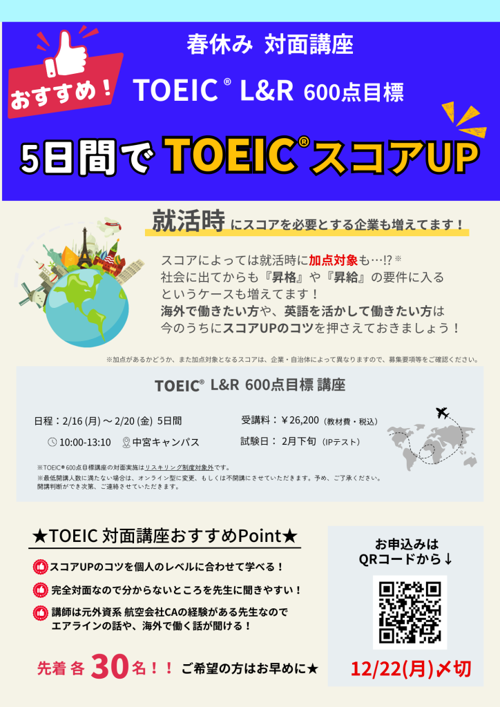 ★外大生に人気!春休みTOEIC L&R スコアUP対面講座★