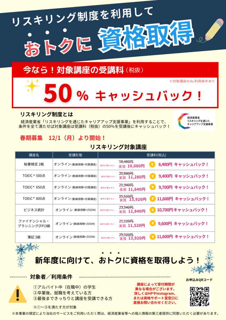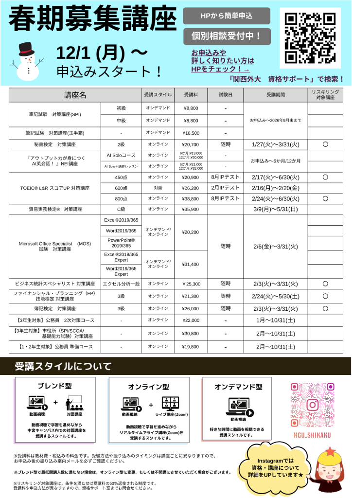 関西外国語大学 資格サポート室です。12/1(月)から春期募集を開始!